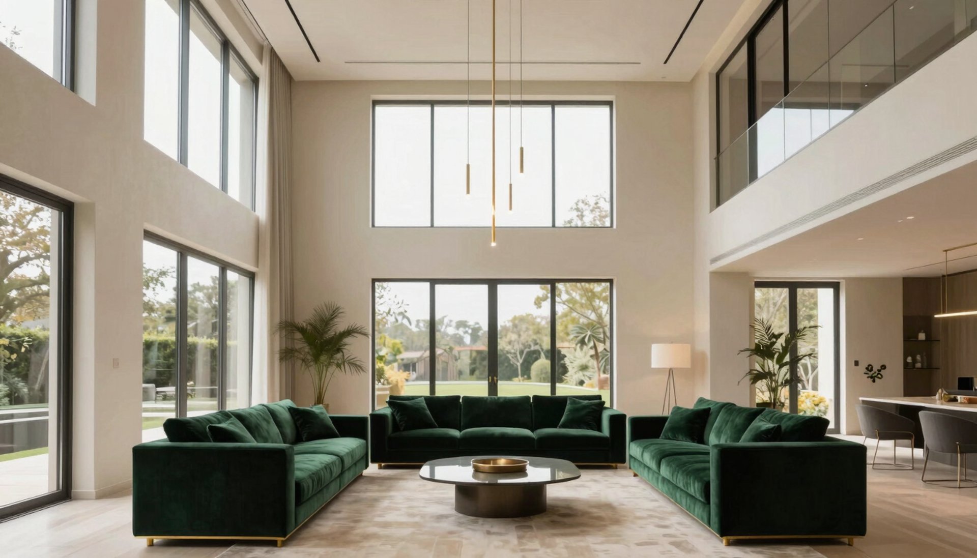 Our living room designs focus on spaciousness and quiet luxury. By incorporating rich textures and a minimal color palette of soft whites and deep greens, we create inviting environments that are both impressive for entertaining and comfortable for sophisticated everyday life.