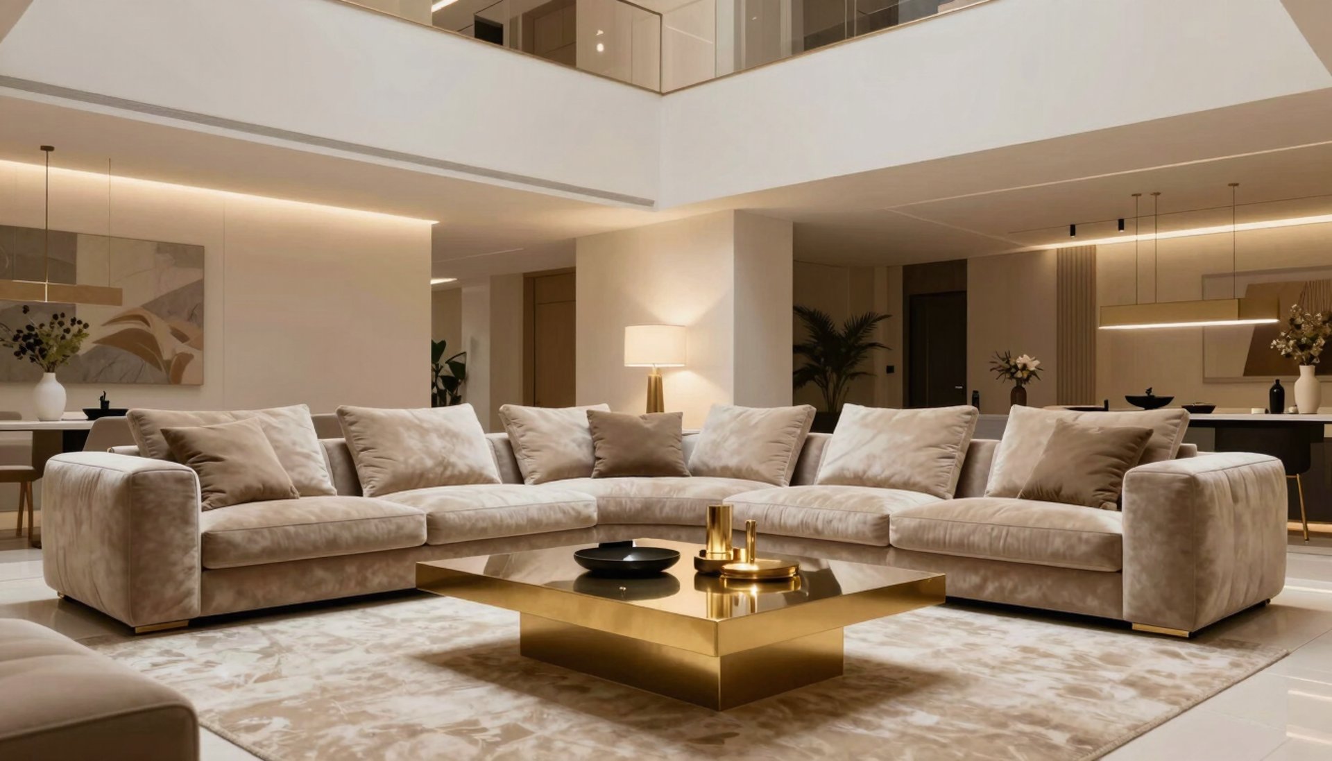 Our living room designs focus on grand proportions and rich material palettes. From soft white marble flooring to custom beige cabinetry, we create social hubs that radiate luxury and comfort.